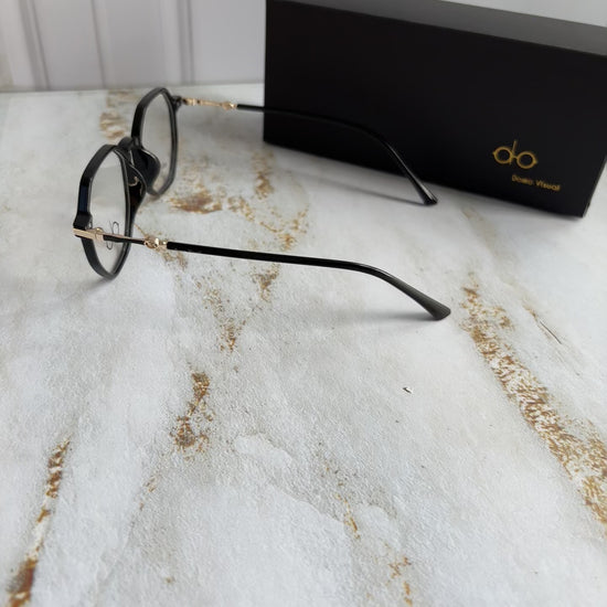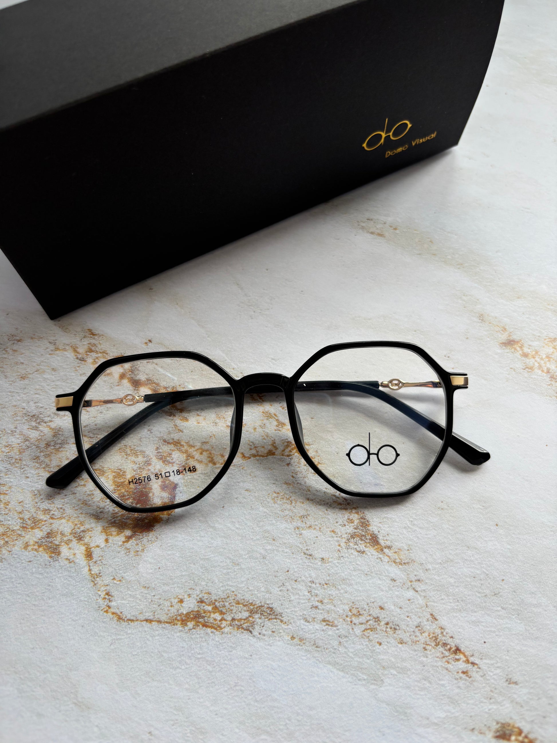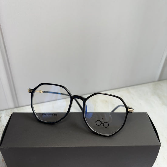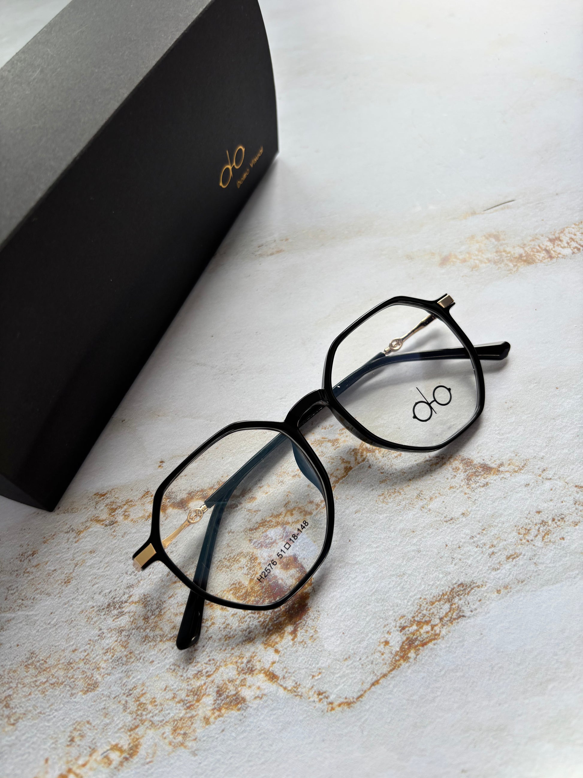 Montura metálica de forma geométrica con acabados finos en negro mate. Tiene detalles sutiles en dorado en la zona de las bisagras que elevan su estilo. La figura poligonal suave le da un aire sofisticado sin ser demasiado clásico.